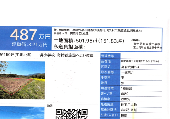 緩い南斜面地、南アルプス眺望満足、通学(小学校)近いです。